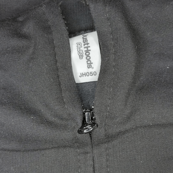 Hoodie zipper and tag about hoodie model. JustHoods AWDis JH050.