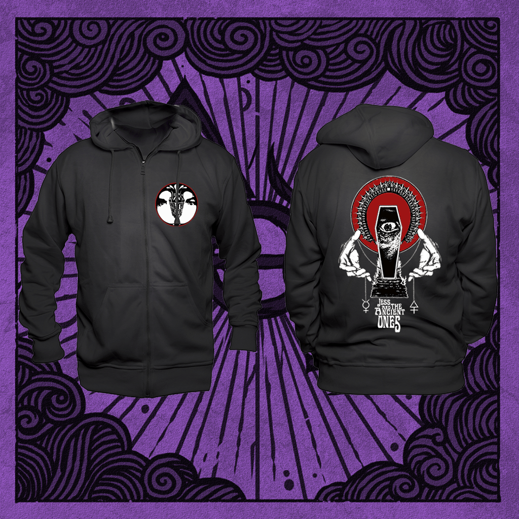 Pic of zipper hoodie on purple background. Hoodie on front and back. pic on hoodie front left round shaped face. Back pi with coffin and palms on the side of coffin. Few occult symbols and text Jess and the Ancient Ones on the bottom